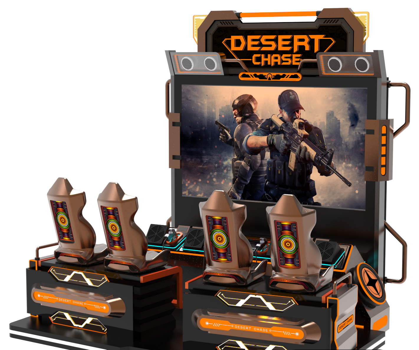 Released by a newer Chinese arcade developer (Blue Motion Games) early in the year, Desert Chase is a 4 player light gun game that sits each player in a seat with their own gun for high-speed vehicle-chase shooting action, but due to the difficulty and increased cost of getting very large items like sit-down arcade cabinets shipped to other parts of the world from China, this one hasn’t been seen in the wild very much, at least in the Western world.